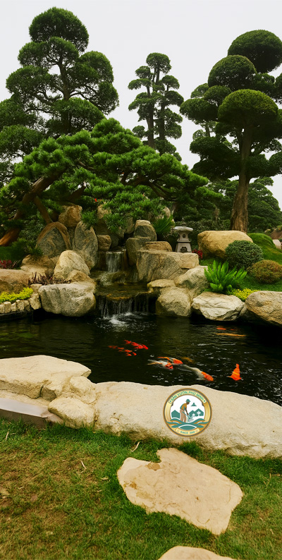 Lắp vòi phun, tạo thác nước, hòn non bộ, cầu gỗ, đèn chiếu sáng.