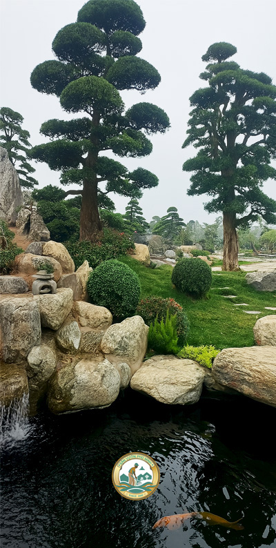 Bố trí cảnh quan xung quanh: đá, cây, cầu gỗ, hòn non bộ, thác nước, tiểu cảnh...