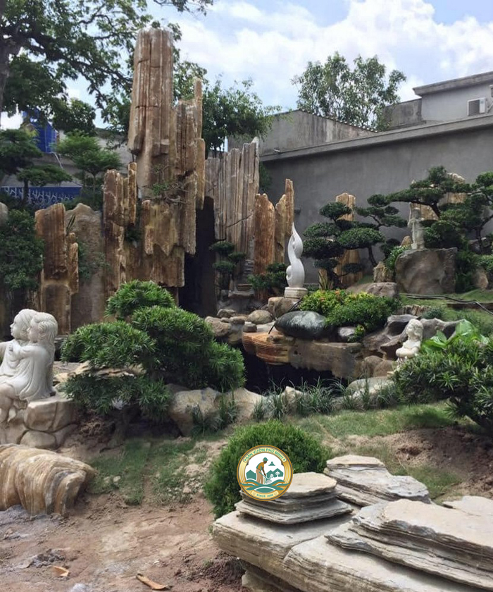 Trang trí sân vườn: Hòn Non Bộ là điểm nhấn nổi bật, tạo không gian sống gần gũi với thiên nhiên.